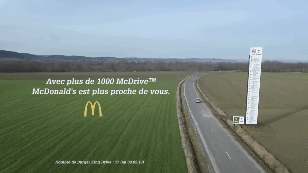 Lorsque McDonald’s dévoile sa publicité en 2016, la marque — forte d’une implantation massive en France — met en scène un immense panneau routier indiquant qu’un Burger King se trouve à des dizaines de kilomètres, alors qu’un McDrive est à seulement quelques minutes.